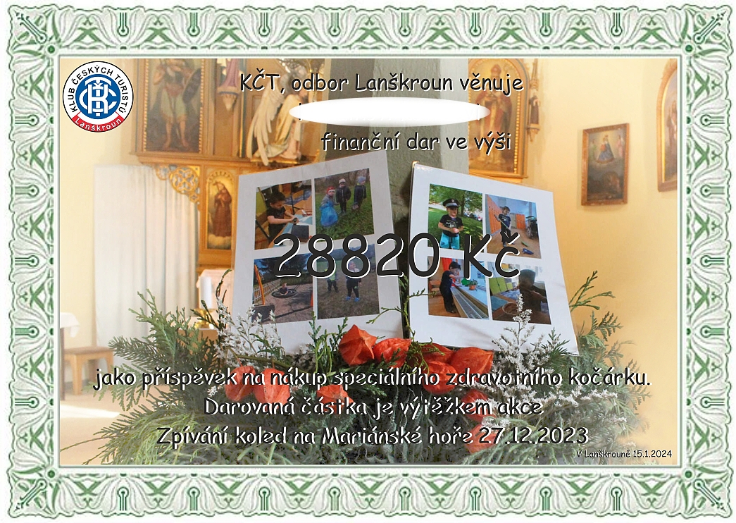 Vybraná částka činí 28.820 Kč. Předseda KČT Lanškroun Zdeněk Šesták vybranou částku spolu s paní Kotyzovou předal Honzíkově mamince, ta za ni pořídí vozík, který chlapci umožní jednodušší pohyb a větší samostatnost v každodenním životě.