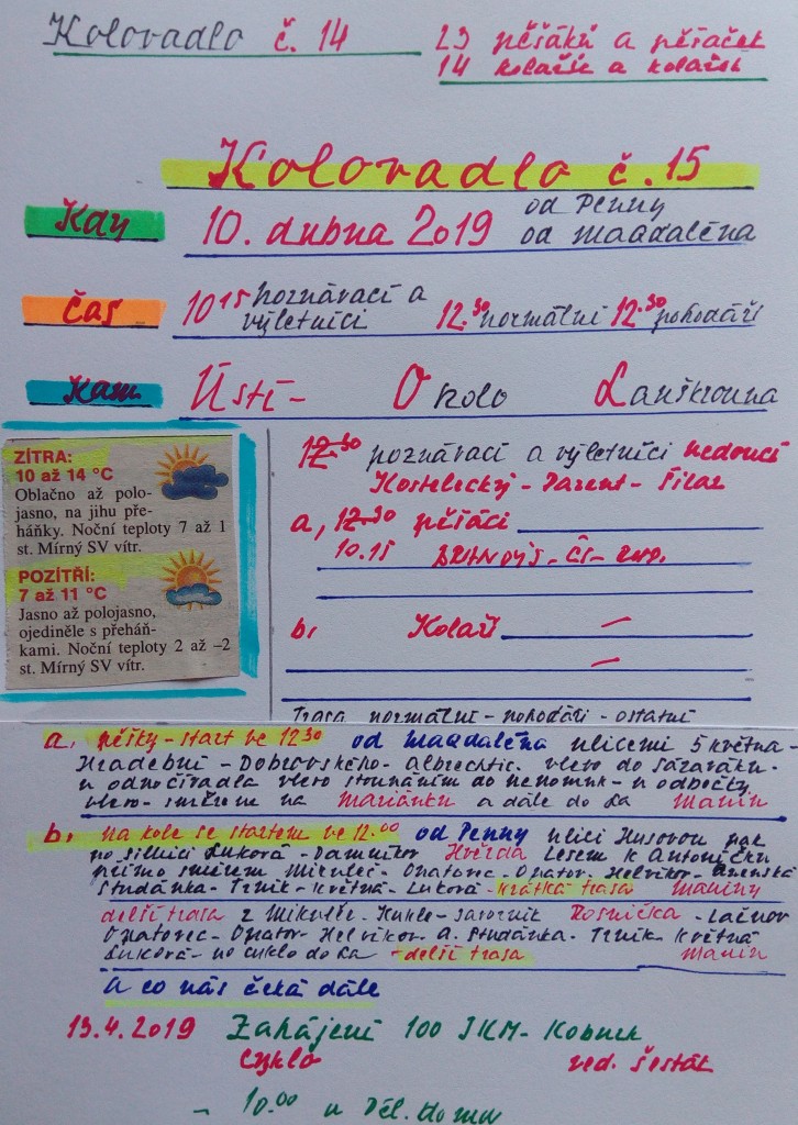 Výletníci jedou na kolo, odjezd ve 12 hod. od Penny. Trasa Zádolka, Opatovec, Opatov, Lanškroun.
