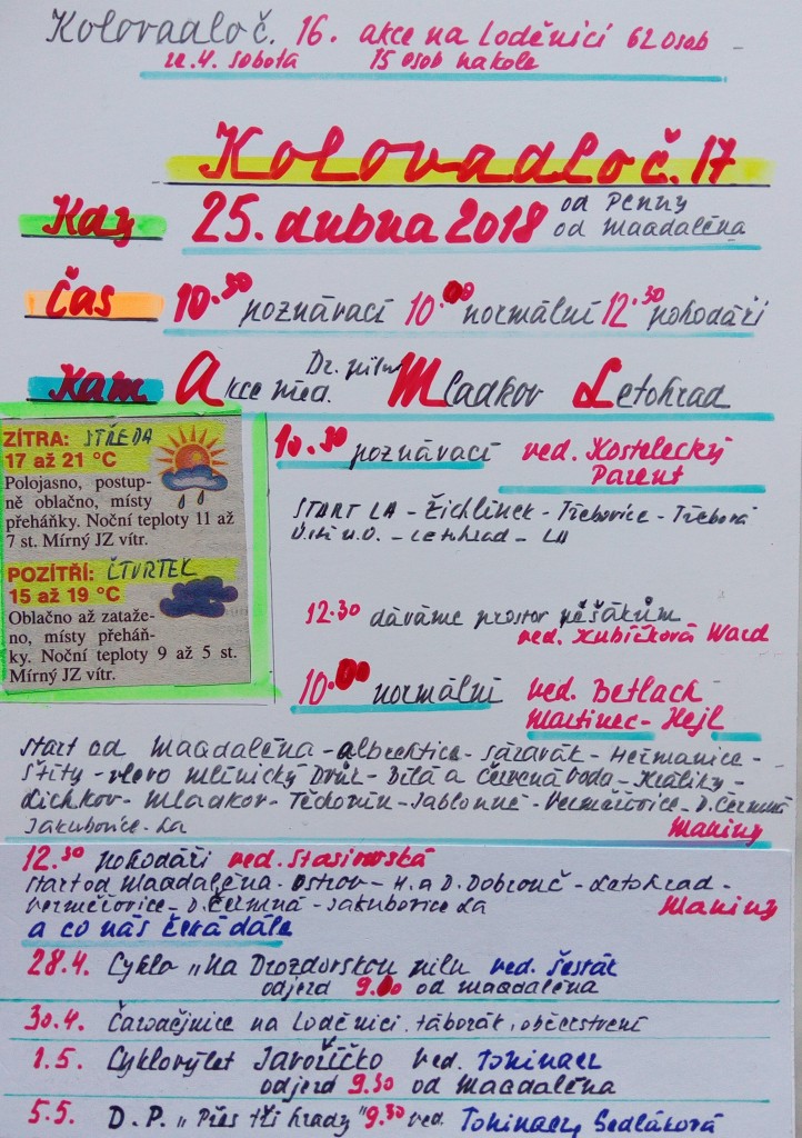 Tuto sobotu je termín pro cykloakci Drozdovská pila. My většinou jezdíme pouze část z celé trasy v délce cca 50 km. Pro Kolovadlo 17 jsme proto pro poznávací skupinu naplánovali onu 2. část, kterou normálně nejezdíme. Odjezd v 10.30 hod. od PENNY po trase Žichlínek, Luková, Damníkov, Česká Třebová, Ústí n.Orl. (razítko cyklopecky), Dolní Dobrouč, (Letohrad), Lanškroun. Délka cca 70 km.