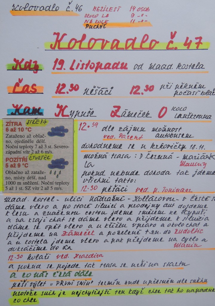 Na příští středu 26.11.2014 je připravován výlet do Pardubic a okolí. Trasy chystá náš dlouholetý člen a nyní obyvatel Pardubic František Černý. Odjezd v dopoledních hodinách, bude upřesněno v příštím Kolovadle. Případné bližší informace u Emila Parenta.