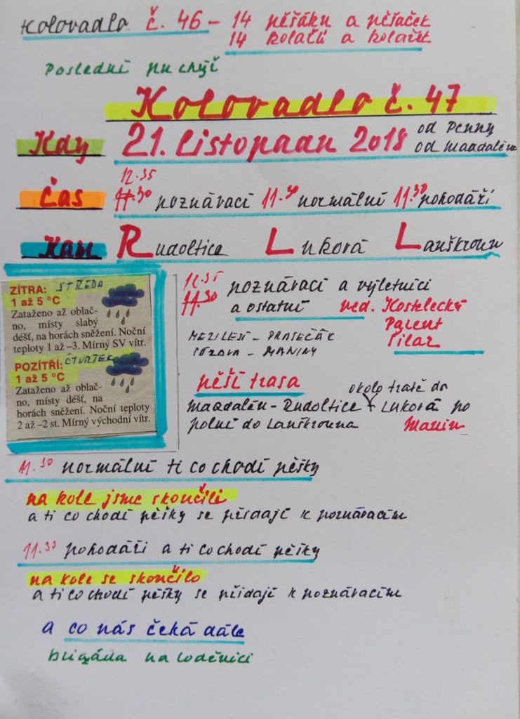 Pěší trasa: odjezd autobusem z autobusového nádraží ve 12.33 hod. (12.36 hod. od Majlantu) směr Štíty na zastávku Mezilesí. Odtud pěšky odlišnou cestou než minule přes Rychtářský les, kolem prasečáku do Sázavy a na Maniny. Délka pěší trasy cca 10 km.